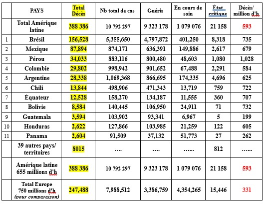 Avec plus de 388 000 décès déclarées l'Amérique latine est, de loin, la partie du monde la plus affectée par l'épidémie pour le nombre total de décès et la deuxième pour le taux de mortalité par million d'h.