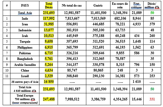 C'est donc l'Asie de l'Ouest (Inde, Iran et pays voisins du Moyen-Orient) qui enregistre l'essentiel des pertes en Asie. A noter que l'Iran est toujours un pays sous sanctions économiques «maximales» de la part des USA (au profit d'Israël) et enregistre le taux de mortalité le plus élevé d'Asie à 379 décès/million d'h. Ce taux reste toutefois très inférieur aux taux des continents américains et de l'Europe de l'Ouest.
