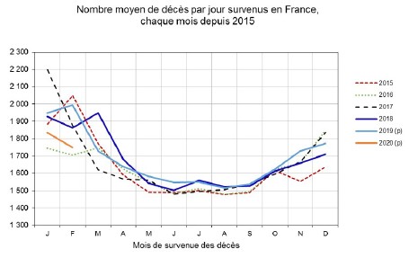 Pour décrypter correctement le tableau ci dessus, il faut garder à l'esprit que le nombre moyen de décès quotidien, en France est saisonnier. L'INSEE nous apprend qu'en moyenne, il décède 1 500 personnes/ jour en été en France et 1 800 en hiver, toutes causes confondues. Il nous apprend que la moyenne hivernale du nombre de décès peut monter jusqu'à 2200 par jour comme en Janvier 2017. Il nous apprend, enfin, que le nombre de décès, en France, augmente d'année en année parce qu'arrivent au grand âge - celui de la santé fragile - les générations du baby-boom.