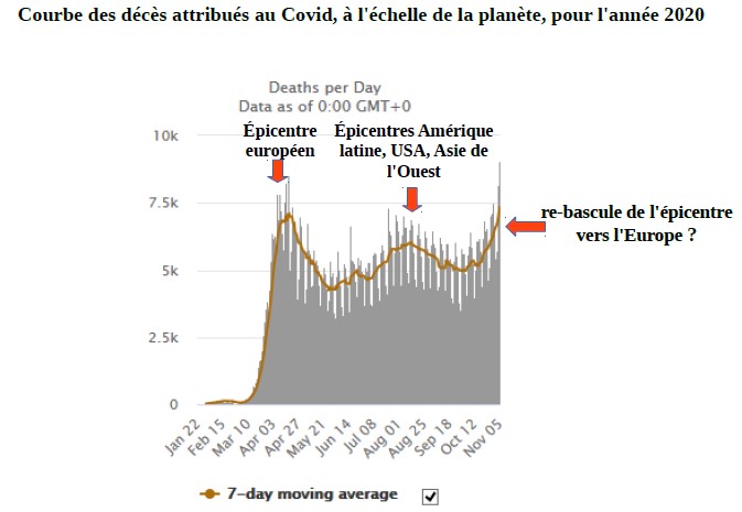 Résumé de la situation: Au niveau planétaire, si la contamination progresse principalement en Europe, la courbe générale des décès ne permet pas encore de parler de 2ème vague «mondiale». En effet, la situation se stabilise, voire s'améliore «progressivement» sur certains continents ou sous-continents (Afrique, Océanie, Asie, Amérique latine) et ne se détériore que sur ceux qui marchent vers l'hiver (Europe et Amérique Septentrionale). Un facteur saisonnier semble donc se confirmer dans l'évolution de cette épidémie avec laquelle nous allons devoir vivre encore de longs mois, voire plusieurs années. Le nouvel épicentre de l'épidémie est désormais clairement européen, l'UE de l'ouest étant, de très loin, la plus affectée par le rebond.