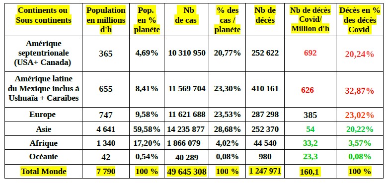 S'agissant des décès Covid, il convient de rappeler que les nombres déclarés sont très incertains..... Les exemples du Royaume Uni qui soustrait 5 303 décès à son total le 12 août ou de l'Espagne qui a fait de même en Juin dernier, de la Colombie, de la Bolivie, de l'Argentine et du Mexique qui rajoutent quelques milliers de décès à leur bilan depuis début septembre, sont là pour le prouver. Certains pays en développement n'ont pas les moyens de collecter des informations fiables. D'autres sous estiment le nombre de décès en oubliant, par exemple, volontairement ou non, de comptabiliser les décès à domicile, d'autres surestiment fortement ce nombre en attribuant à la seule Covid, les décès de très nombreux patients souffrant de multiples pathologies (dont «le grand âge»). Plusieurs de ces pathologies, autres que la Covid ont souvent été la cause première du décès.