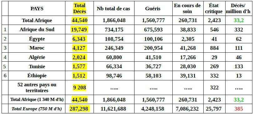 La mortalité liée au Covid y est dérisoire. A l'exception de l'Afrique du Sud, la chloroquine y a été massivement employé pour traiter les patients. C'est d'ailleurs l'Afrique du Sud qui est en situation préoccupante avec 45% du nombre de nouveaux cas et de décès du continent.