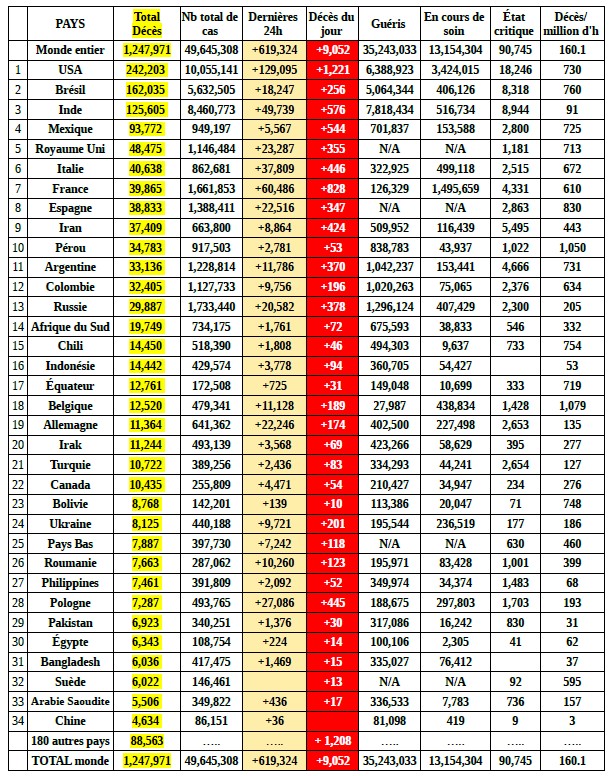 1,25 million de décès (+54 700 en 1 sem) ; 35,24 millions de guérisons (+2 millions en 1 sem).