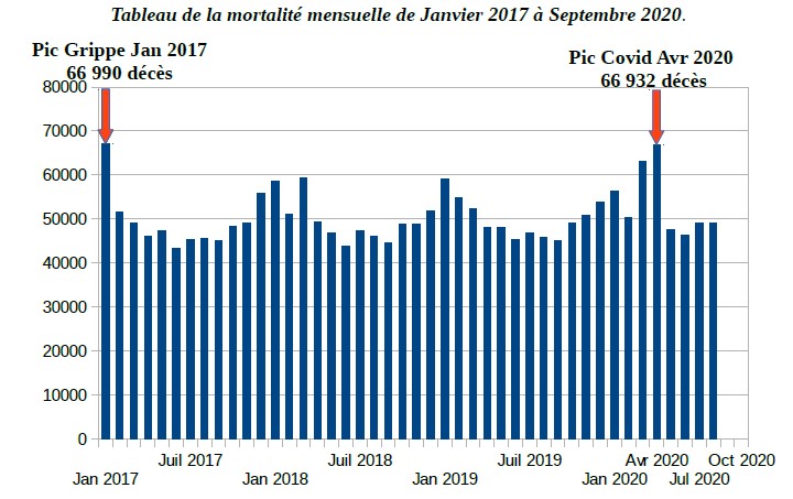 Pour relativiser l'importance de l'épisode épidémique 2020 en France, il faut se souvenir qu'au mois de Janvier 2017, pic épidémique de la grippe saisonnière de cette année là, le nombre de décès en France, toutes causes confondues, a été, selon l'INSEE, de 66 990,. Ce nombre de décès était supérieur à celui d'avril 2020, pic épidémique de la crise Covid-19: 66 392 décès. Nos médias et nos hommes politiques n'en avaient pas fait tout un fromage et la France n'avait pas eu recours au confinement général du pays, solution moyenâgeuse, pour limiter la contagion et la létalité d'un virus grippal 2017 particulièrement meurtrier.