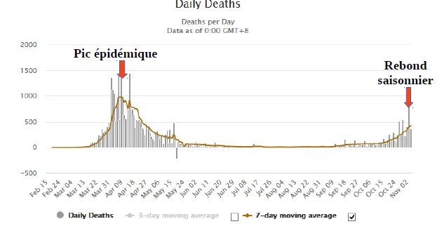 Enfin, la France enregistre, en moyenne d'octobre et novembre, 12 200 décès par semaine, toutes causes confondues. La semaine dernière, 2 835 personnes, la plupart très âgées, sont décédées «avec» le Covid-19 ce qui représente, à peu près, 23 % des décès hebdomadaires....)