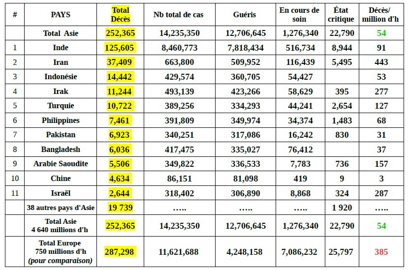 C'est donc l'Asie de l'Ouest (Inde, Iran et pays voisins du Moyen-Orient) qui enregistre l'essentiel des pertes en Asie. A noter que l'Iran est toujours un pays sous sanctions économiques «maximales» de la part des USA (au profit d'Israël) et enregistre le taux de mortalité le plus élevé d'Asie à 443 décès/million d'h. Ce taux reste toutefois très inférieur aux taux des continents américains et de l'Europe de l'Ouest.