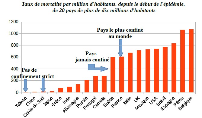Depuis le début de l'épidémie, l'Indonésie, pays le plus touché d'Asie de l'Est enregistre un taux de mortalité dérisoire de 53 décès par million d'habitants. Taïwan, pays le moins touché et qui n'a jamais confiné, déclare un taux de mortalité de 0,3 par million d'h (7 décès de la Covid pour 24 millions d'h). Le Japon, quant à lui, déclare 1 806 décès pour 126 millions d'h soit 14 décès /million d'h.