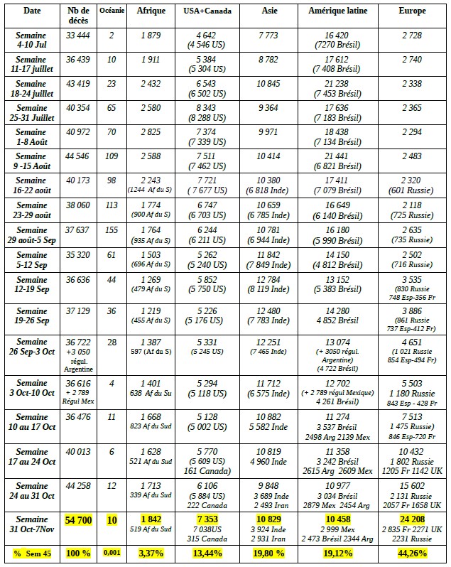 Un tableau présente ci après les bilans du 7 novembre 0h00 GMT des 34 pays ayant déclaré plus de 4 000 décès (93% des pertes)