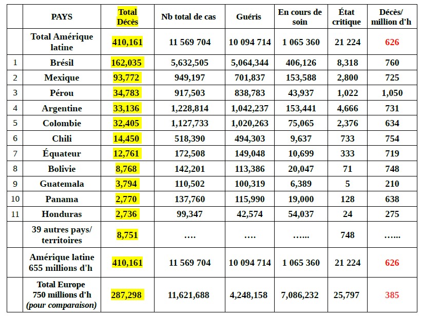 Avec plus de 410 000 décès déclarées l'Amérique latine est, de loin, la partie du monde la plus affectée par l'épidémie pour le nombre total de décès et la deuxième pour le taux de mortalité par million d'h.