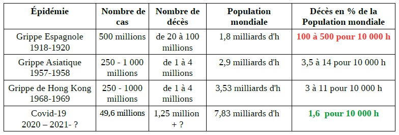 En clair, et quoiqu'en disent nos médias mainstream et les membres de l'exécutif dans leur manière biaisée de présenter les choses, cette épidémie aura été extrêmement peu meurtrière sur la planète en 2020. L'espèce humaine ne risque pas encore l'extinction puisque le nombre d'habitants aura encore augmenté sur notre Terre, en 2020, de plus de 80 millions..... malgré l'épidémie: Pas de quoi jouer les autruches et se cacher la tête dans le sable (confinement du pays et destruction de son économie) à chaque épisode épidémique. Ces épisodes risquent, en effet, de se reproduire dans les années à venir, avec des virus mutants, difficiles à combattre et aucun pays ne peut s'offrir le luxe de confinements à répétition.