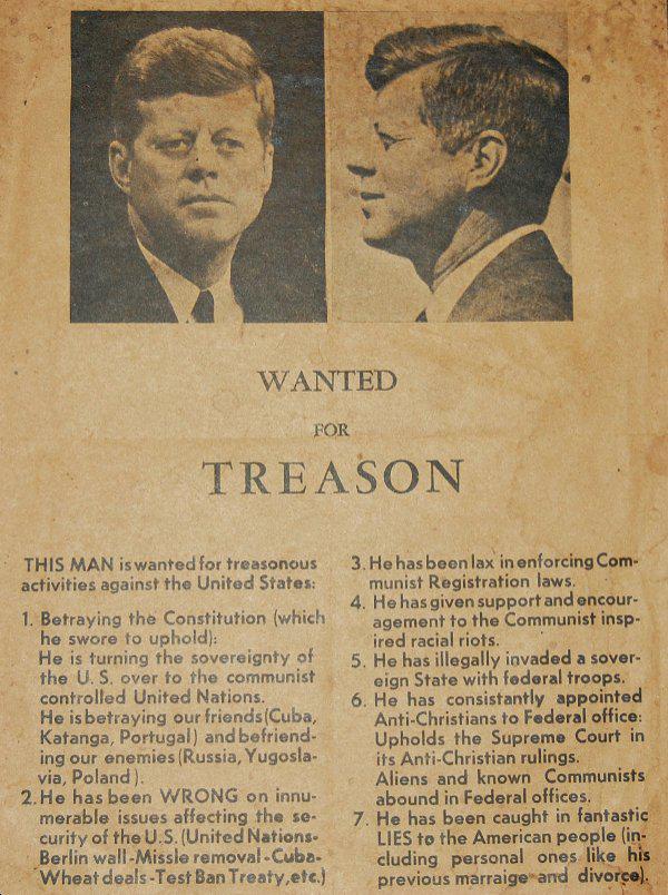 Le président Kennedy a été assassiné à Dallas, Texas, le 22 novembre 1963. Deux jours avant son assassinat, un prospectus de haine contre Kennedy (voir photo) circulait à Dallas, accusant le président d'activités traîtresses, notamment d'être un sympathisant communiste.