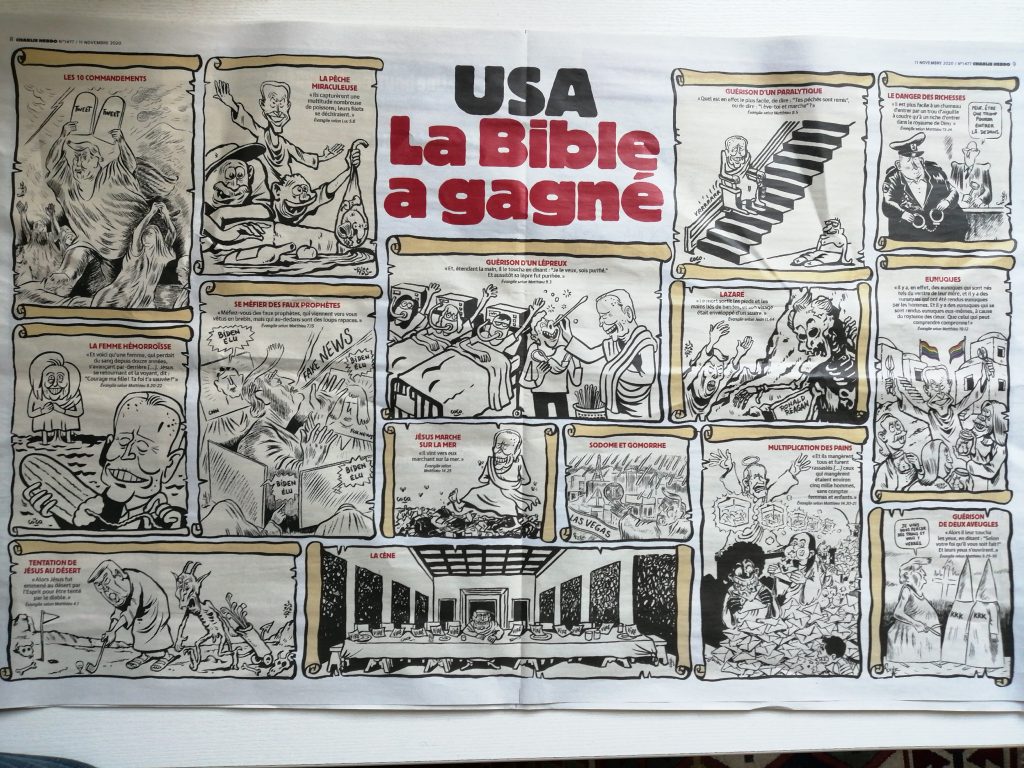 De nouveau, Charlie Hebdo est devenu, à la suite de la décapitation de Samuel Paty, le symbole de la liberté d'expression. Les hommes politiques, dans leurs tweets et déclarations publiques, ont multiplié les fades et vibrants panégyriques de l'hebdomadaire porno-satyrique, rivalisant de figures dans une grotesque danse de Saint-Guy autour du totem républicain. Les unes de Charlie représentant Mahomet se lamentant « c'est dur d'être aimé par des cons » ont été projetées en grand sur les façades des hôtels de ville de Toulouse et Montpellier.