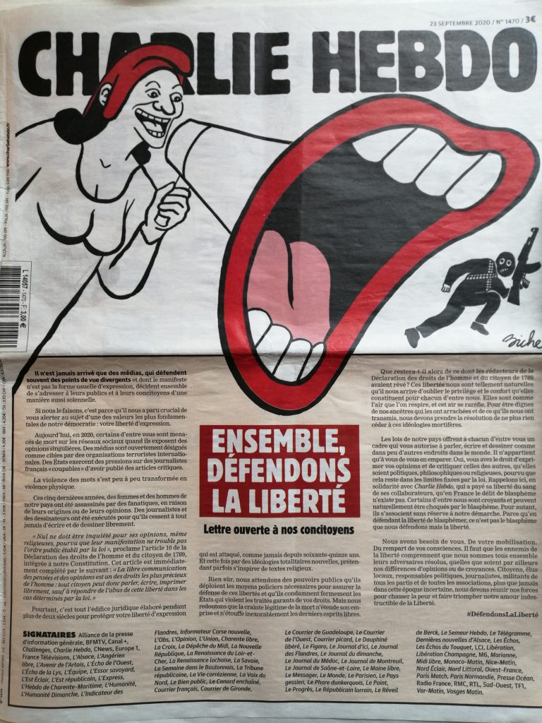 La lettre ouverte de Charlie Hebdo du 23 septembre pour « défendre la liberté » d'expression est d'autant plus hypocrite et immorale qu'elle est librement exprimée dans un contexte où la censure se fait de plus en plus féroce. Citons à ce propos les premières lignes de l'éditorial de Jérôme Bourbon le 30 septembre 2020 dans Rivarol : « Difficile d'aller plus loin dans le cynisme et la tartufferie. Alors qu'Hervé Ryssen était incarcéré depuis près d'une semaine à la prison de Fleury-Mérogis pour délit d'opinion, plus d'une centaine de journaux, de revues, de magazines, dont les principaux quotidiens et hebdomadaires, signaient un texte s'inquiétant des menaces extrêmement graves pesant sur la liberté d'expression. (...) Aucun de ces journaux qui proclament pourtant de manière grandiloquente leur « amour de la liberté » n'a cité, même de façon allusive, le cas d'Hervé Ryssen condamné à rester en prison 19 mois (aux dernières nouvelles) pour avoir simplement usé de sa liberté d'expression. Leur attachement à la liberté d'expression est donc à géométrie variable. (...) Ces directeurs dénoncent les pressions exercées sur la presse par certains États mais il se gardent bien de citer l'entité sioniste et ses courroies de transmission comme le CRIF (dont le président, Francis Khalifat, a été reçu deux fois en un mois par le ministre de la justice!) et la LICRA qui exercent un chantage permanent à l'antisémitisme dès qu'on critique les crimes de l'État-voyou ou que l'on dénonce les menées liberticides d'un certain lobby judéo-sioniste. »