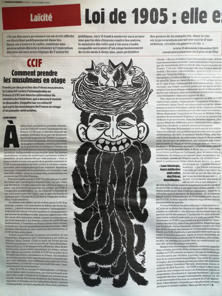 Pour se rendre compte des limites de l'exercice dans un pays comme la France, nous suggérons à Charlie Hebdo d'oser en une le dessin satyrique suivant suivante, à l'occasion du prochain dîner du Conseil Représentatif des Institutions (Juives) de France (CRIF), grand messe annuelle républicaine à laquelle se presse chaque année en Bel-Amis serviles et sans scrupules tout ce qui compte comme personnalités politiques avides d'exercer un simulacre de pouvoir en France : Le président du CRIF Francis Khalifat en train de sodomiser Emmanuel Macron tout nu la bite gouttant et le regard au septième ciel. Francis Khalifat serait vêtu d'un T-shirt arborant le drapeau israélien et fanfaronnerait dans une bulle : « On est chez nous et on vous encule ! ». En bas de l'attelage, en miniature, Sarkozy et Hollande amoureusement suspendus chacun à une couille du président du CRIF, le premier disant dans une bulle : « Putain qu'est-ce que c'était bon ! », le second « Euheu... ». Cette caricature serait barrée par une manchette disant en lettres capitales : « DÎNER DU CRIF : LA FRANCE SOUS INFLUENCE ». Cette une serait accompagnée d'un dossier de deux pages qui aurait pour titre : « CRIF : comment prendre les juifs en otages », sous-titré : « enquête sur un collectif qui a pris les juifs en otages d'un pseudo-antisémitisme » ; une autre double-page, intitulée : « OCCIDENT : LA TORAH A GAGNE », illustrerait dans une série de caricatures 15 citations de l'Ancien Testament et du Talmud choisies parmi celles intimant aux Juifs la posture d'un racisme fier et décomplexé envers les « goyim », faisant l'apologie de l'usure et du prêt à intérêt pour asservir les particuliers et les peuples, érigeant le vol, le mensonge, et l'assassinat au rang d'actions de grâce (« cacher ») dès lors qu'elles sont ont des non-juifs pour cibles, défendant la pédophilie et l'esclavage, affirmant explicitement que les Juifs sont une race des seigneurs appelée de toute éternité à régner sans pitié sur l'ensemble du genre humain, et se réservant le droit sacré de recourir au génocide de tous les peuples qui refuseraient de souscrire à ce projet. Remplacez dans ce qui précède « juif » par « musulman », « Torah » par « Bible », et « CRIF » par « CCIF » et vous avez une synthèse des numéros 1057, 1475 et 1477 de Charlie Hebdo du 28 octobre 2020 !