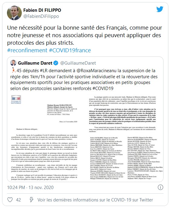 Le 13 novembre 2020, 45 députés Les Républicains ont signé une lettre destinée à la ministre déléguée aux sports, Roxana Maracineanu, dans laquelle ils demandent la suspension de l'interdiction de sortir à plus d'un kilomètre de chez soi et pendant plus d'heure, qui a cours depuis le retour des mesures de confinement, le 29 octobre.