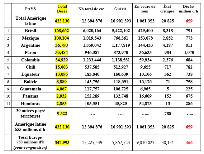 Avec plus de 432 000 décès déclarées l'Amérique latine est, de loin, la partie du monde la plus affectée par l'épidémie pour le nombre total de décès et la deuxième pour le taux de mortalité par million d'h.