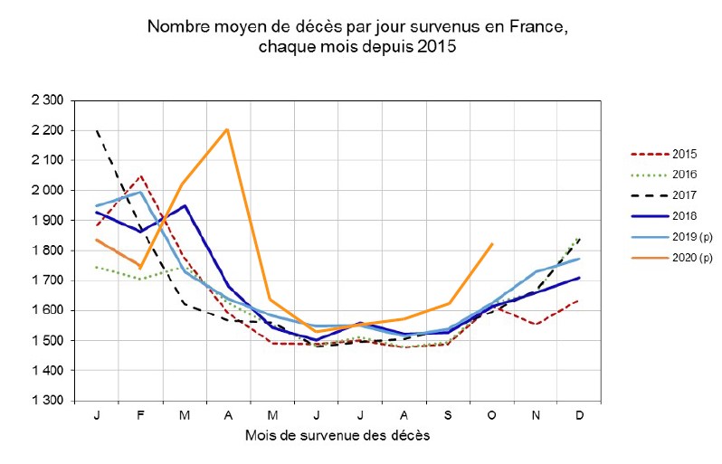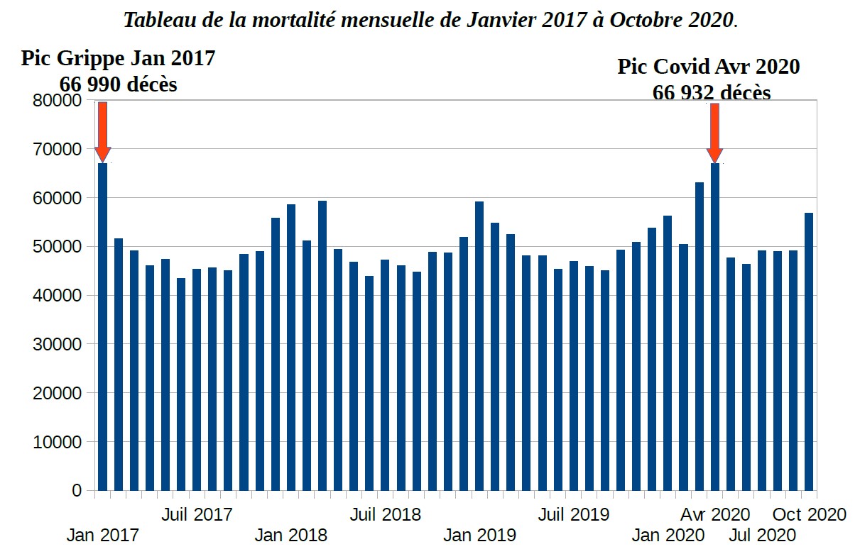 Pour remettre la mortalité mensuelle, en France en perspective, il faut rappeler que celle ci a varié, entre 2017 et 2020, entre un plus bas estival de 43 400 et un plus haut hivernal à 67 000 constatés en juillet et janvier 2017. Aucun des mois de l'année 2020 n'est sorti de ces limites, jusqu'à présent. Il est d'ailleurs peu probable que ces limites soient franchies en novembre ou en décembre 2020, alors même que le nombre de personnes âgées ne cesse de croître en France. Pour le mois d'Octobre, le nombre cumulé et provisoire de décès enregistré par l'INSEE n'est que de 56 751 (dernier nombre publié).