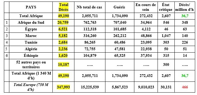 La mortalité liée au Covid y a été dérisoire. A l'exception de l'Afrique du Sud, la chloroquine y a été massivement employé pour traiter les patients. C'est d'ailleurs l'Afrique du Sud qui a payé le prix le plus fort avec 37% des cas et 42,5% des décès du continent.....
