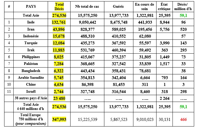C'est donc l'Asie de l'Ouest (Inde, Iran et pays voisins du Moyen-Orient) qui enregistre l'essentiel des pertes en Asie. A noter que l'Iran est toujours un pays sous sanctions économiques «maximales» de la part des USA (au profit d'Israël) et enregistre le taux de mortalité le plus élevé d'Asie à 520 décès/million d'h. Ce taux reste toutefois très inférieur aux taux des continents américains et de l'Europe de l'Ouest.