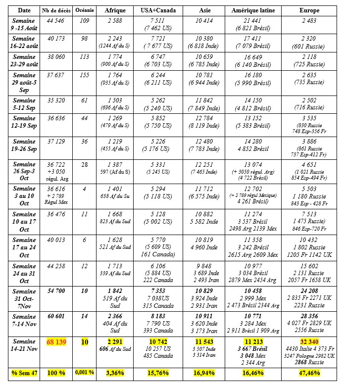 A l'échelle de la planète, la pandémie amplifie son rebond. Ce rebond est important mais n'est pas brutal. Le nombre des décès a commencé à croître depuis début octobre dans l'hémisphère nord qui marche vers l'hiver. L'aspect saisonnier de cette maladie virale semble donc vouloir s'inscrire dans la durée, comme il l'est pour la grippe. 68 139 décès «avec» la Covid en 1 semaine, c'est 15 % de plus que la semaine dernière.