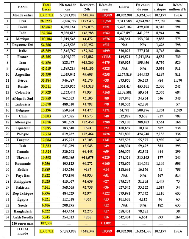 Un tableau présente ci après les bilans du 21 novembre 0h00 GMT des 34 pays ayant déclaré plus de 5 200 décès (92% des pertes)