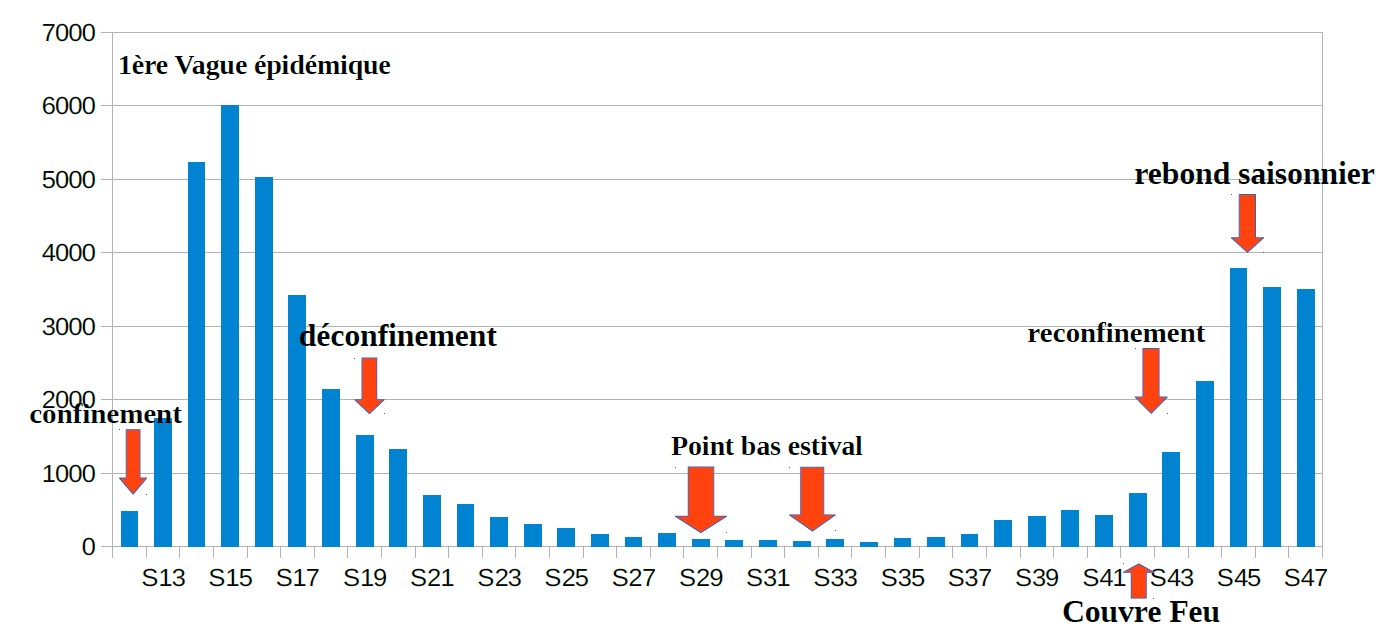 Nombre de décès hebdomadaires en France attribués au Covid 19 de la Semaine 12 (S12) à la semaine 47 (S47) donc de fin mars 2020 au 21 novembre 0h00 GMT)