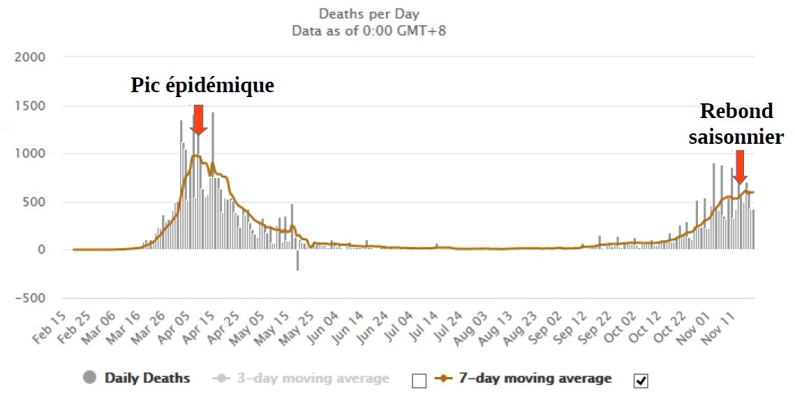 Voici la courbe des décès quotidiens (en barre grise) et la moyenne quotidienne sur 7 jours (en orange) depuis le 1er jour de l'épidémie. On peut distinguer l'ampleur d'un rebond plus progressif qu'en avril. Faut-il vraiment garder le pays sous cloche et poursuivre la casse de son économie?