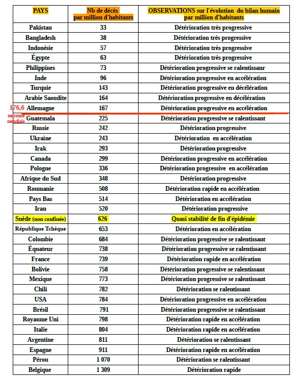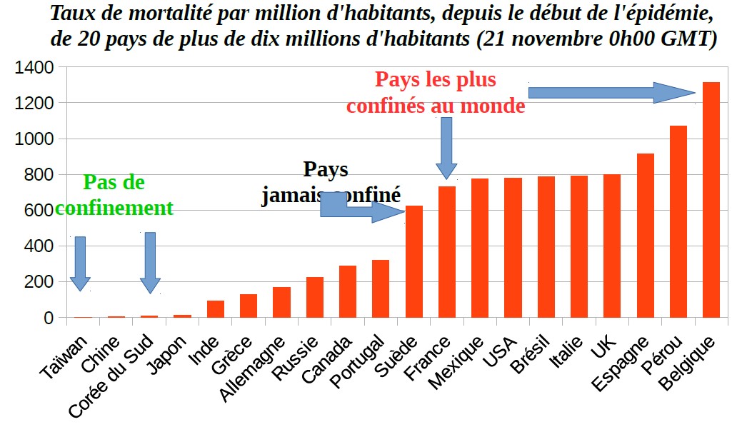 Toutes les projections apocalyptiques faites par les «scientifiques»(?) (ceux qui tiennent le haut du pavé et qui sont à l'origine des mesures de confinement général prises par certains gouvernements) se sont avérées fausses, et pas qu'un peu. Ceux ci prévoyaient, pour la Suède, 96 000 décès pour la fin mai en cas de non confinement. La Suède a fait le choix de ne pas confiner. Elle compte 6 406 décès le 21 novembre, et son taux de mortalité (0,633 pour mille habitants) est de moitié inférieur à celui de la Belgique (1,3 pour mille h) et inférieur à celui de la France (0,739 pour mille h). France et Belgique sont pourtant les deux championnes du monde du confinement, tant pour la durée que pour les modalités......