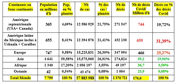 S'agissant des décès Covid, il convient de rappeler que les nombres déclarés sont très incertains..... Les exemples du Royaume Uni qui soustrait 5 303 décès à son total le 12 août ou de l'Espagne qui a fait de même en Juin dernier, de la Colombie, de la Bolivie, de l'Argentine et du Mexique qui rajoutent quelques milliers de décès à leur bilan depuis début septembre, sont là pour le prouver. Certains pays en développement n'ont pas les moyens de collecter des informations fiables. D'autres sous estiment le nombre de décès en oubliant, par exemple, volontairement ou non, de comptabiliser les décès à domicile, d'autres surestiment fortement ce nombre en attribuant à la seule Covid, les décès de très nombreux patients souffrant de multiples pathologies (dont «le grand âge»). Plusieurs de ces pathologies, autres que la Covid ont souvent été la cause première du décès.