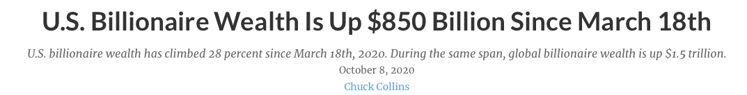 La richesse combinée des milliardaires américains a augmenté de 850 milliards de dollars du 18 mars 2020 au 8 octobre 2020, soit une augmentation de plus de 28 %. Cette estimation ne tient pas compte de l'augmentation de la richesse au cours de la période précédant le 18 mars, qui a été marquée par une série de krachs boursiers. (Voir Michel Chossudovsky, Vers un chaos économique mondial et une destruction de la société, novembre 2020)
