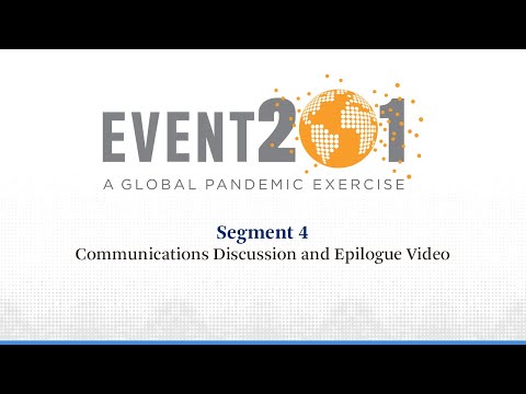 Vidéo : L'exercice de pandémie Event 201. 18 octobre 2019. Se concentre sur l'ampleur de la pandémie. La simulation traite également de la manière de gérer les médias sociaux en ligne et la « désinformation ». Écoutez attentivement) [en anglais]