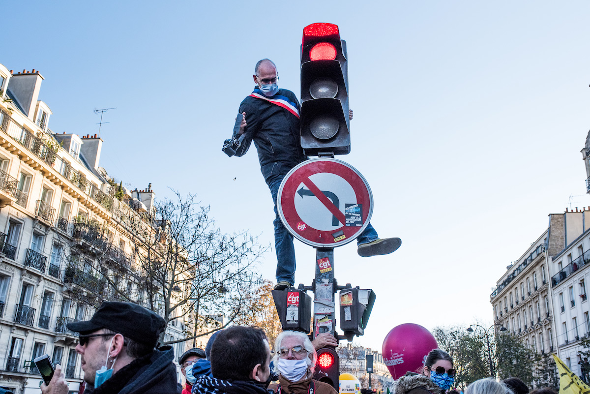 Élu de la République et maire de Gennevilliers, Patrice Leclerc grimpe sur un feu rouge pour prendre des photos de la foule.