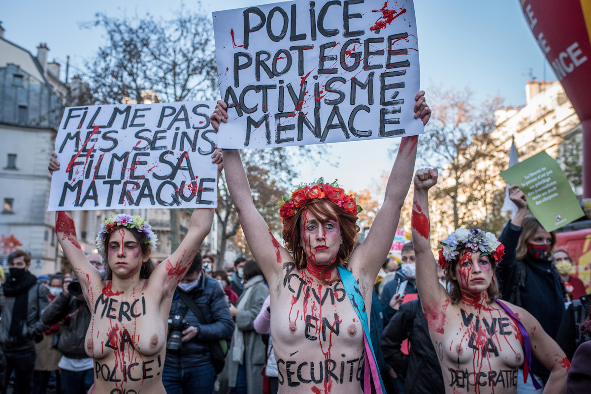 Dans le cortège, les Femen ont défilé seins nus pour dénoncer la loi Sécurité globale et signaler les dangers que cette dernière représente pour l'activisme.