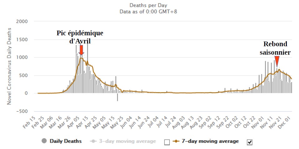 Le nombre des décès quotidiens russes a culminé à 589 décès le 2 décembre. Le taux de mortalité russe par million d'habitants a atteint les 289 mais il reste encore près de 3 fois inférieur à celui de la France (839).