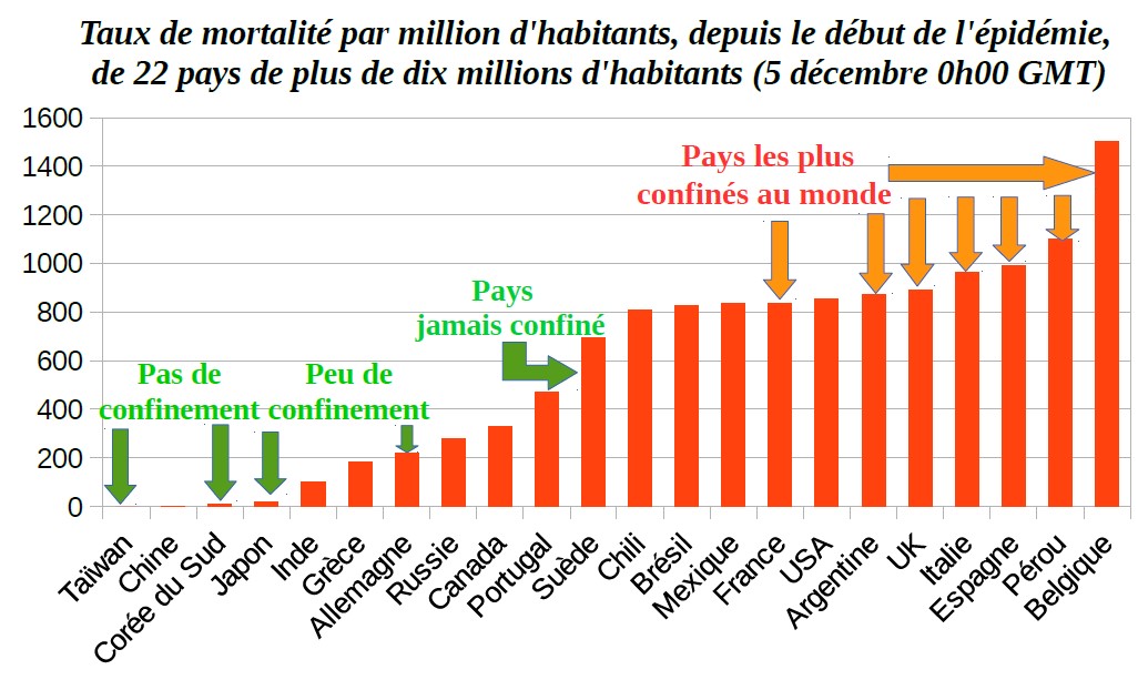 Ce que le citoyen occidental, anesthésié par ses médias mainstream nationaux, ne réalise pas, c'est l'ampleur de l'écart du bilan humain entre les deux régions évoquées plus haut. Entre Taïwan et la Belgique, les taux de mortalité s'établissent aujourd'hui dans un rapport de 1 à 5 000 (cinq mille). En clair, la Belgique, qui a pourtant beaucoup confiné, a déclaré 5 000 fois plus de décès attribués à la Covid-19 par million d'habitants que Taïwan (qui n'a pas confiné) et cent fois plus que le Japon (qui a peu confiné.