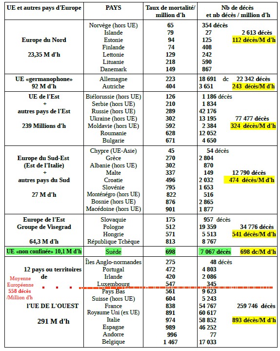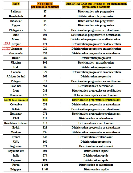 A la lecture du tableau qui suit, on réalise que tous les pays qui ont fait le choix d'un confinement général et de longue durée sont les pays qui enregistrent les taux de mortalité les plus élevés au monde. Ce constat est d'ailleurs cohérent avec des études espagnoles et portugaises qui indiquent que la contamination a été plus forte, dans leur pays, chez les personnes confinées plutôt que chez celles qui se rendaient quotidiennement sur leur lieu travail pour y exercer leur activité avec les gestes barrières.
