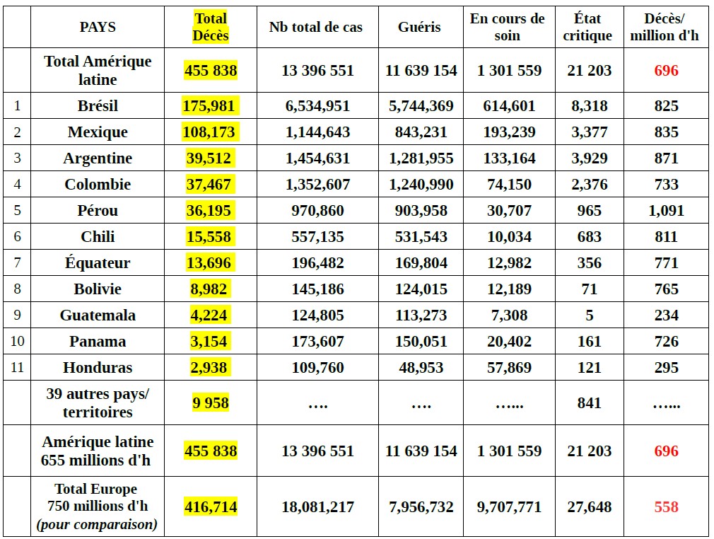 Avec près de 456 000 décès déclarées l'Amérique latine est, de loin, la partie du monde la plus affectée par l'épidémie pour le nombre total de décès et la deuxième pour le taux de mortalité par million d'h.