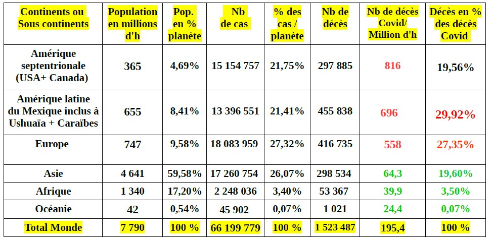 Dans de telles conditions, s'ajoutant, pour les USA, à la saisonnalité, on comprend mieux l'explosion de la contamination et la hausse importante de la mortalité depuis début octobre sur l'ensemble du continent américain.