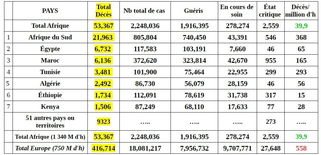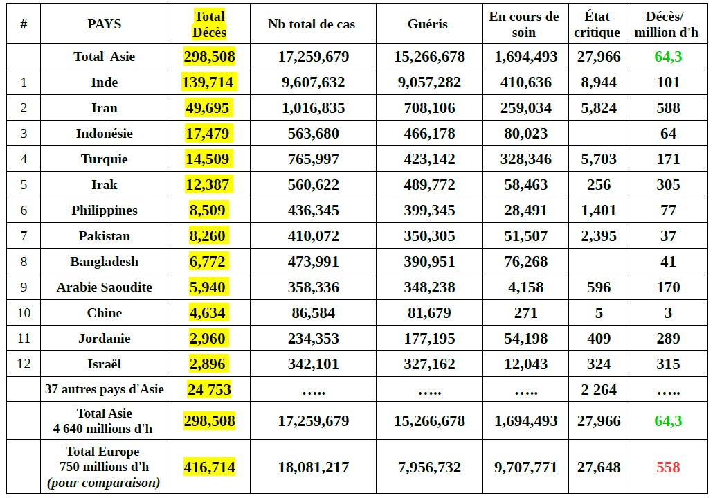 C'est donc l'Asie de l'Ouest (Inde, Iran et pays voisins du Moyen-Orient) qui enregistre l'essentiel des pertes en Asie. A noter que l'Iran est toujours un pays sous sanctions économiques «maximales» de la part des USA (au profit d'Israël) et enregistre le taux de mortalité le plus élevé d'Asie à 588 décès/million d'h. Ce taux reste toutefois très inférieur aux taux des continents américains et de l'Europe de l'Ouest.