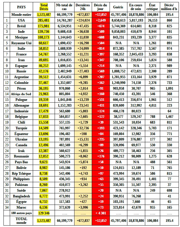 Un tableau présente ci après les bilans du 5 décembre 0h00 GMT des 34 pays ayant déclaré plus de 6 000 décès (91,5% des pertes)