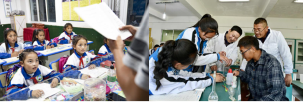 A gauche : Des élèves suivent un cours dans la ville de Qamdo de la région autonome du Tibet, le 14 septembre 2020. A droite : Un enseignant du Hubei et un enseignant local dirigent des élèves dans une expérience de chimie au lycée n° 1 de Shannan, dans la région autonome du Tibet, le 7 mai 2019.