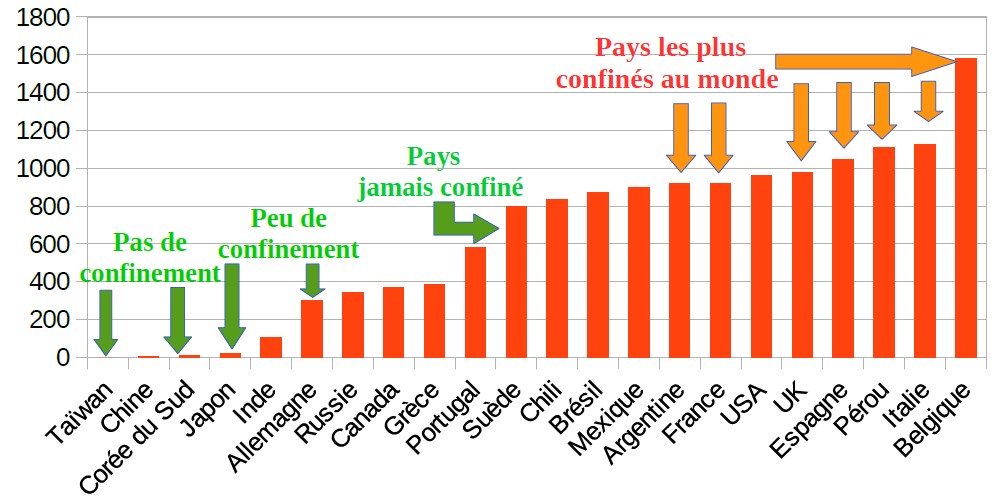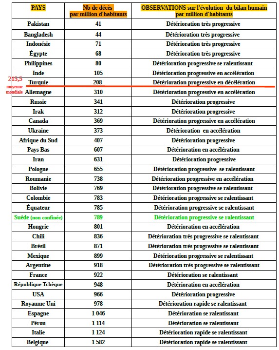 Évoquons aussi, le cas du Brésil, dont le Président Bolsonaro, très critiqué par les politiques et les médias français parce qu'il disait que le confinement était une solution de pays riche et qu'il n'en voulait pas pour son pays. En fin d'année 2020, le Brésil, grand pays latin comme la France, l'Espagne et l'Italie affichera un taux de mortalité bien inférieur à ceux de ces trois pays, champions du monde du confinement.
