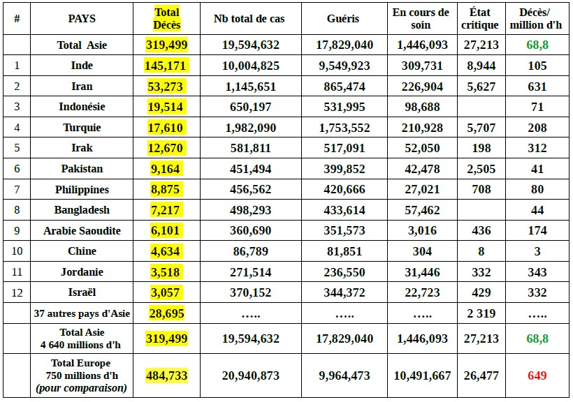 C'est donc l'Asie de l'Ouest (Inde, Iran et pays voisins du Moyen-Orient) qui enregistre l'essentiel des pertes en Asie. A noter que l'Iran est toujours un pays sous sanctions économiques «maximales» de la part des USA (au profit d'Israël) et enregistre le 2ème taux de mortalité le plus élevé d'Asie, derrière l'Arménie qui a cumulé la guerre et la Covid,, à 631 décès/million d'h. Ce taux reste toutefois très inférieur aux taux des continents américains et de l'Europe de l'Ouest.