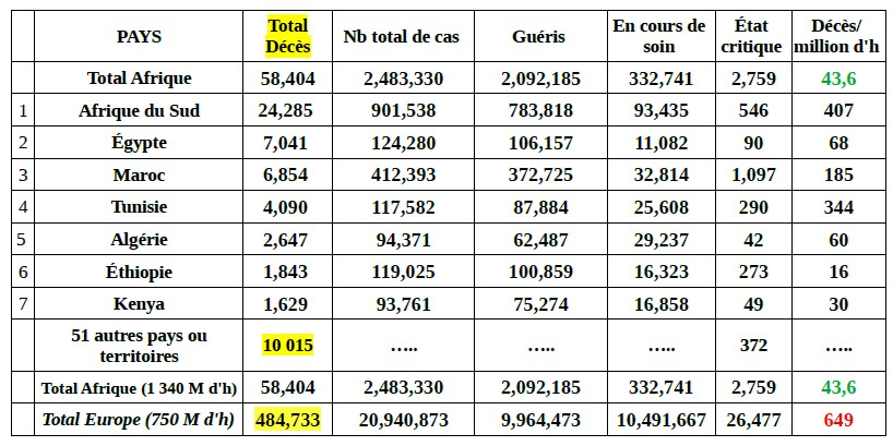 La mortalité liée au Covid y a été dérisoire. A l'exception de l'Afrique du Sud, la chloroquine y a été massivement employée pour traiter les patients. C'est d'ailleurs l'Afrique du Sud qui a payé le prix le plus fort avec 36,3% des cas et 41,6% des décès du continent.....
