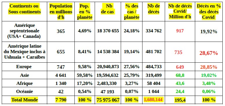 L'épidémie s'est stabilisée en Asie de l'Ouest (Inde, Bangladesh, Pakistan, Arabie Saoudite, Irak, Iran). Elle marque le pas en Afrique (Afrique du Sud, Égypte). Au rythme actuel d'évolution de l'épidémie les caps des 80 millions de cas et des 1,8 million de décès devraient être franchis le 31 décembre 2020, ce qui représentera, à très peu près, 2,9% des décès de l'année 2020 sur la planète.