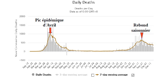 Le nombre des décès quotidiens russes a culminé à 613 décès le 11 décembre. Le taux de mortalité russe par million d'habitants a atteint les 341 mais il reste encore près de 3 fois inférieur à celui de la France (922).