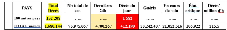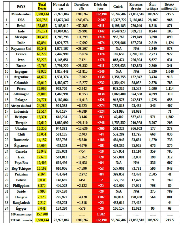 1,68 million de décès (+79 721en 1 sem) ; 53,242 millions de guérisons (+ 3,6 millions en 1 sem).