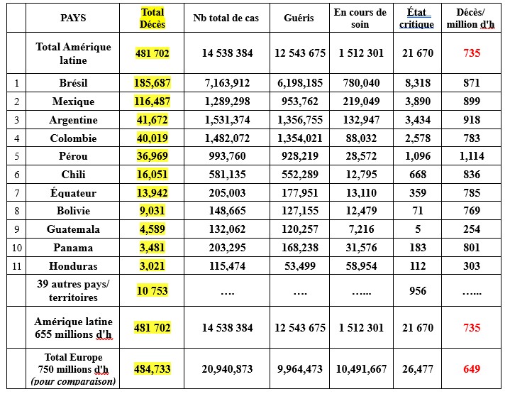 Avec près de 481 702 décès déclarées l'Amérique latine n'est plus la partie du monde la plus affectée par l'épidémie pour le nombre total de décès. Elle est désormais devancée par l'Europe. Elle est aujourd'hui la deuxième pour le taux de mortalité par million d'h,. derrière les USA.