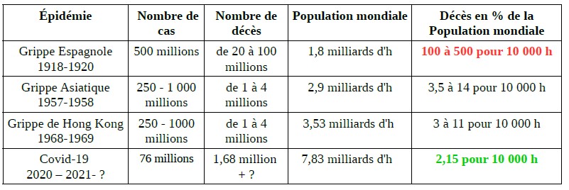 En 2020, 1% des habitants de la planète aura été testé positif à la Covid-19 mais seulement 0,25 pour mille habitants en sera décédé (1 décès sur 4 000 habitants). Rien à voir avec les grandes épidémies des siècles passés..... d'autant que ces décès ont majoritairement concerné des personnes âgées, voire très âgées, ayant une très faible espérance de vie.