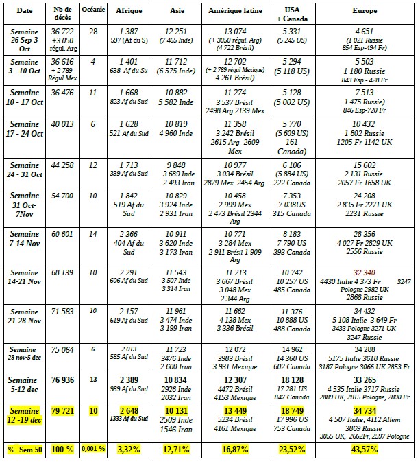 Un tableau présente ci après les bilans du 19 décembre 0h00 GMT des 34 pays ayant déclaré plus de 7 000 décès (90,6% des pertes)